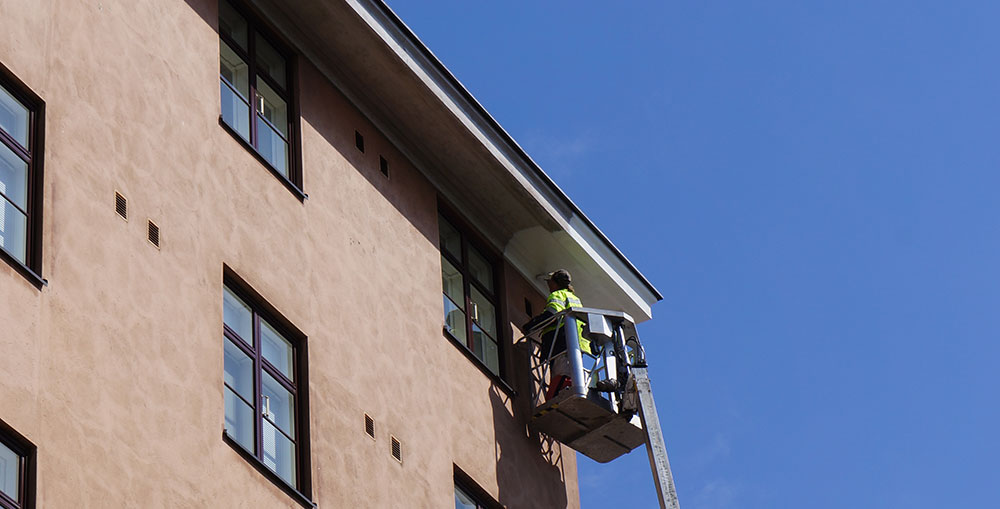 Kerrostalon kattohuoltoa suoritettaessa on usein tarve käyttää turvavaljaita ja niiden lisäksi myös henkilönostimia tai nostokoriautoja, varmistaen työturvallisuuden korkealla.