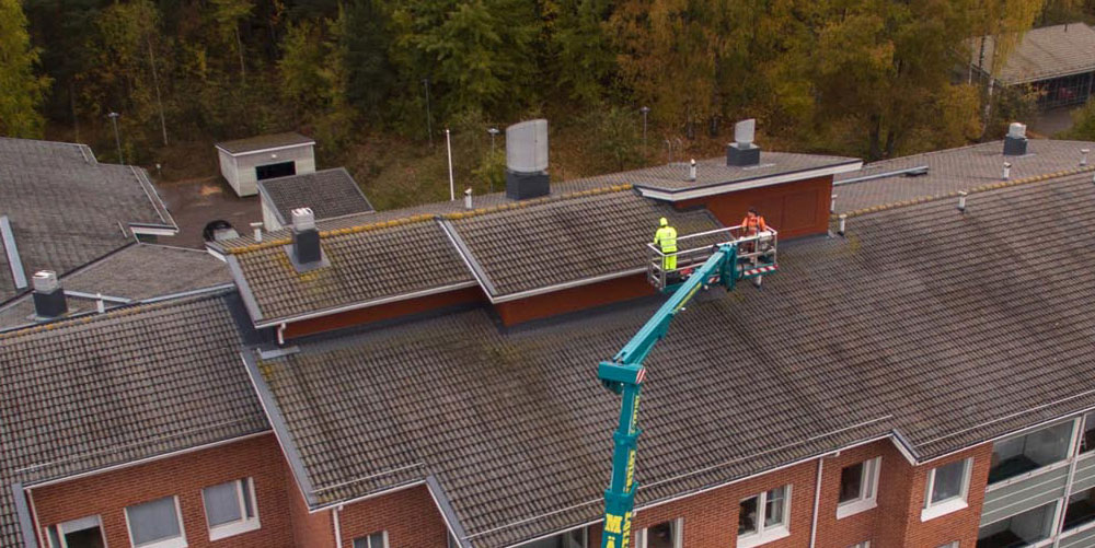 Korkeus asettaa haasteensa myös tarvikkeiden, ihmisten ja työvälineiden nostamiselle ylös sekä purkujätteen tuomiselle alas. Meiltä löytyy riittävä kalusto kerrostalojen kattotöihin: henkilönostimet, nosturiautot ja rakennustelineet helpottavat vaikeampienkin kohteiden työstämistä.